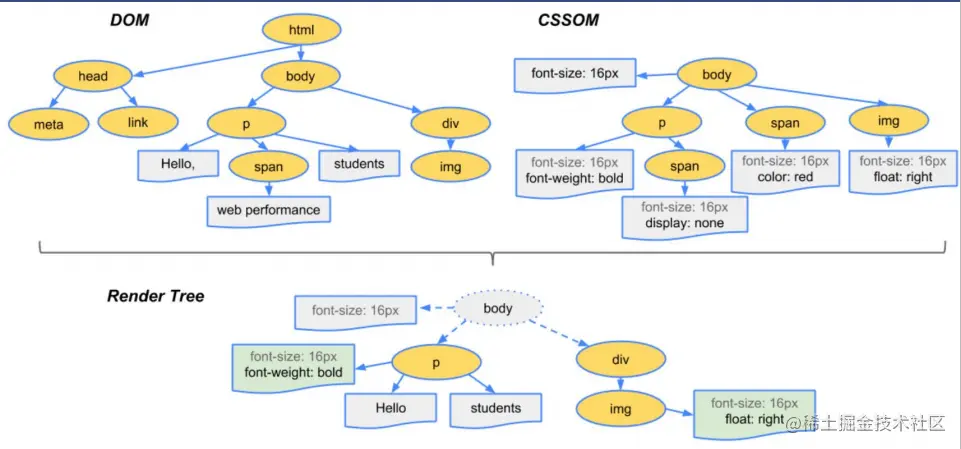 - 将两棵树合并成一棵渲染树(render tree)