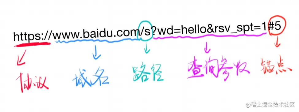 包括:**协议+域名或 IP+端口号+路径+查询字符串+锚点 **